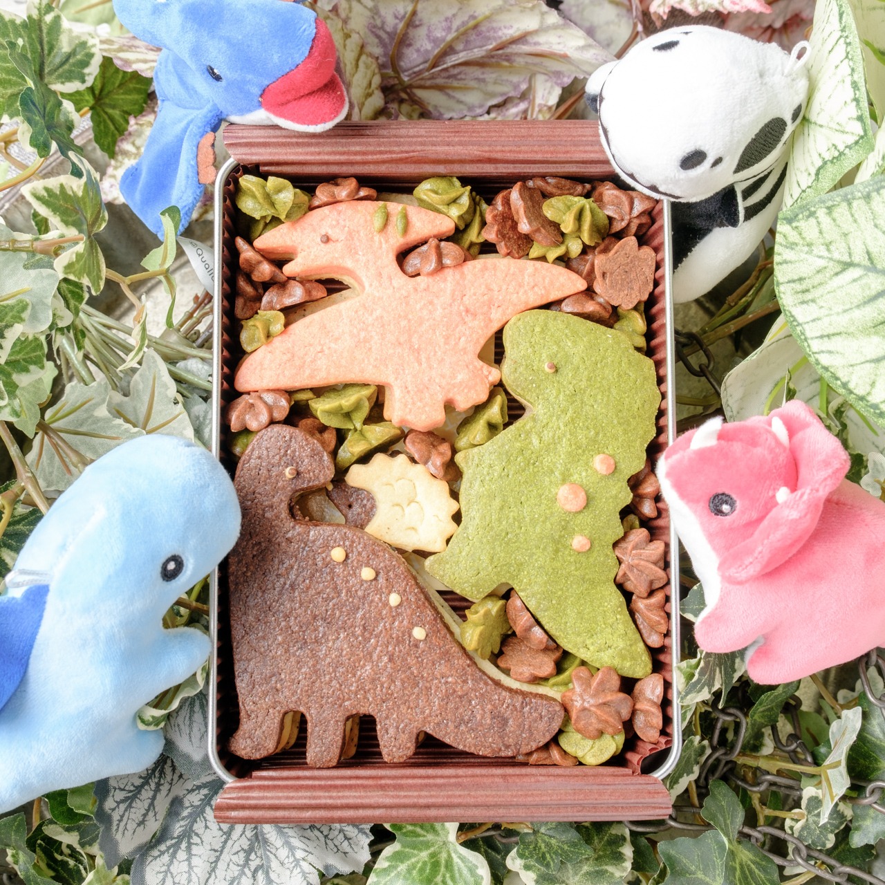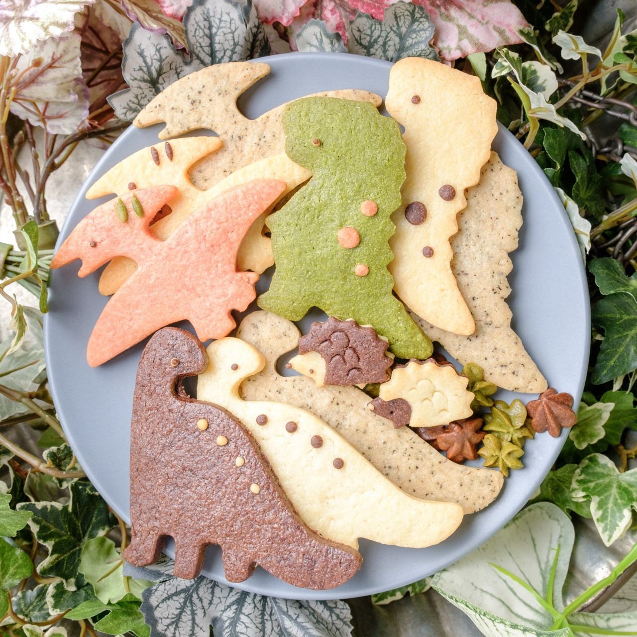 恐竜の緑色は抹茶、茶色はココア、ピンクはビーツを使用しています。
